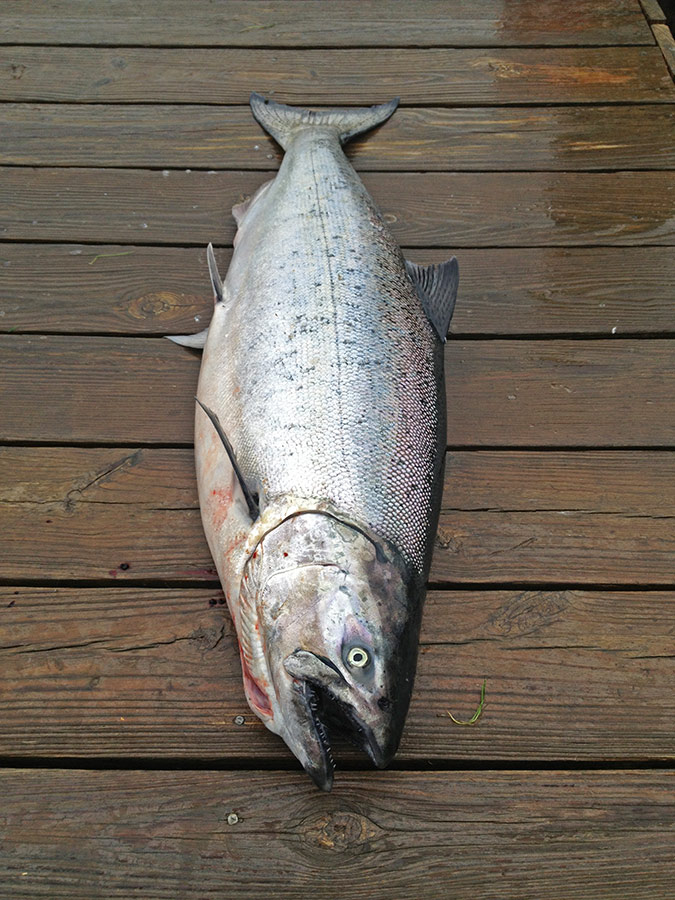 The King or Chinook Salmon that we were looking for are native to the Pacific and are stocked in the lake. For me fishing is really all about relaxation, even more so than birding, it’s a way to just be somewhere pretty and relaxing and turn your mind off for a while. Plus you can bird while you do it – note my Swaros in the pics. I wasn’t really expecting for us to hit any fish so was really just enjoying being out on the boat and taking in the atmosphere and good company, so when the first fish hit the bait it was pretty exhilarating. Fishing with a downrigger a bite is detected when the taught rod and line suddenly springs back as line breaks free from the rig and starts to roll off of the reel. As I was just the guest on the boat I didn’t realize that I was going to be first up on the rod once we had a bite, but I didn’t take much convincing to give it a try. With Terry and Ron providing expert guidance on the technique required to fight the salmon I was soon well into the fight. My only experience like this thus far was movies or TV. Anyway nothing had quite prepared me for how tiring hauling in a few hundred feet of line might be with a strong fish on the end of the line. The general technique is to pull up the rod into a vertical position and then lower it to the horizontal, all the while trying to reel as quickly as possible in order to gain line. The first fish was very nice, hardly a monster, but I think I was exercising muscles that I hadn’t given a workout in a good number of years.