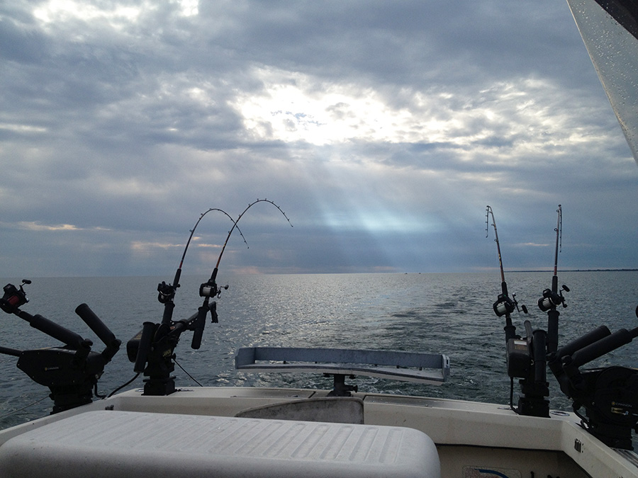So with my time running out at Braddock Bay I finally got around to doing some real fishing out on Lake Ontario. I had been promising our neighbor Ron that I would try to make it out with him a number of times and yet we’d only once really found time to hang out on his deck and put a couple of lines in. When I woke up I actually wasn’t feeling 100% but I had had to bail a couple of times on doing some fishing before and didn’t want to be flaky again. When Ron said we were going to head out on a friends boat and try for some Salmon instead of messing around on his dock I was excited but also a little nervous that I might not be holding onto my breakfast.